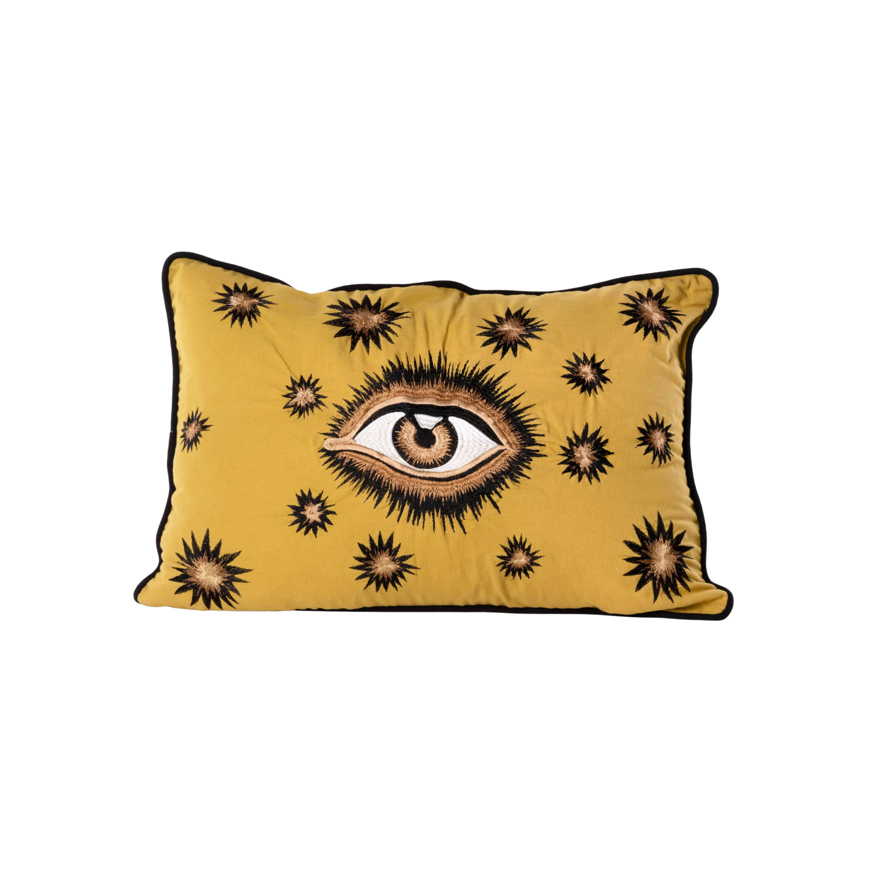 Artful, symbolic, and meticulously handcrafted, the Hand-Embroidered Eye Cotton Pillow by Les Ottomans is a striking decorative accent rich in meaning and visual impact. Made from soft cotton, this pillow features a hand-embroidered stylized eye motif surrounded by starburst details—an iconic symbol of protection, intuition, and spiritual awareness found across many cultures.